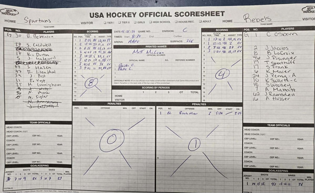 5. Spartans - Jacob Gatewood (Scott Caldwell), 16:33 | 6. Spartans - Kenzie Dunn (Ethan Vogt, Sawyer Hazen), 13:20 | 3. Rebels - Jared Pisinger (Sebastian Frank), 07:58 | 7. Spartans - Sawyer Hazen (Nathan Monk), 04:15 | 8. Spartans - Ethan Vogt (Rich Lilienthal, Sawyer Hazen), 03:01 | 4. Rebels - Jared Pisinger (Scott Woolley, Sebastian Frank), 01:20 |