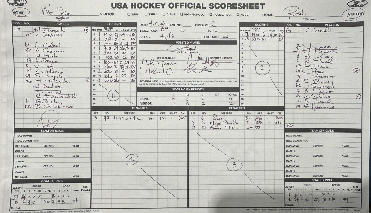 1. Rebels - Kevin Maier (Joey Perry, Kiaya Swartz), 19:10 | 10. Wet Spots - Nathan Monk (Anthony Cappocchi), 18:10 | 11. Wet Spots - Matt McDaniel, 16:40 | 2. Rebels - Sawyer Hazen, 05:20 |