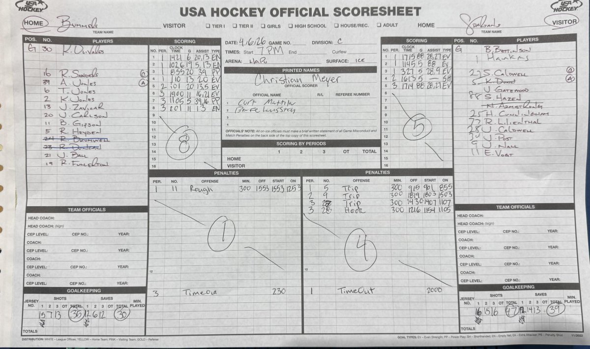 6. Bummers - Brian Gipson (Robyn Sanders, Jake Ball), 19:00 | 5. Spartans - Sawyer Hazen (Jackson Caldwell, Scott Caldwell), 17:14 | 7. Bummers - Reed Heyden (Adam Jones, Robyn Sanders), 11:05 (PP) | 8. Bummers - Brian Gipson (John Zavicar), 00:01 (EN) |