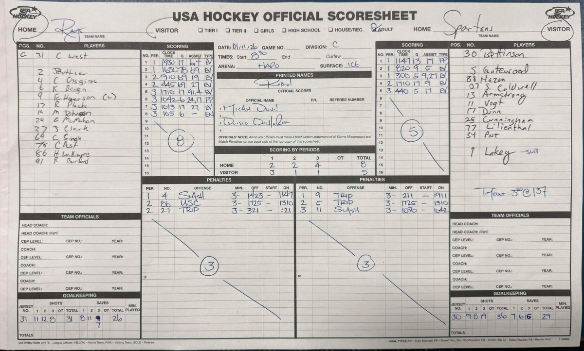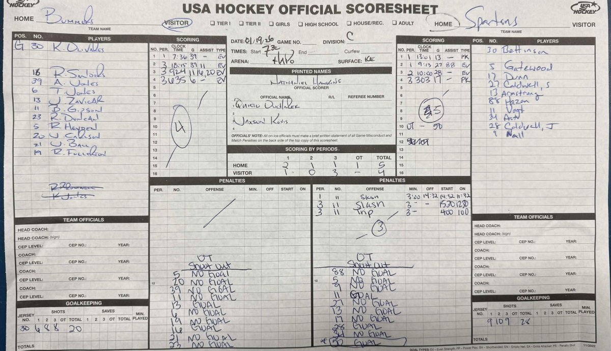 2026-01-19 07:30 PM Spartans Bummers Hapo Ice Pavillion Nate Hawkins 5 - 4 SO