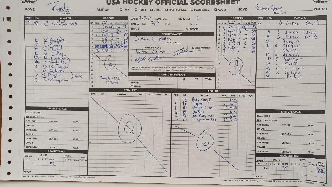 Champs: FARGIN ICEHOLES9 3 0 0 18 12 48 23 Pawned Stars Red 9 3 0 0 18 12 58 40 Lumberjacks 9 3 0 0 18 12 57 48 Rebels 5 6 1 0 11 12 40 47 Minions 4 8 0 0 8 12 48 61 Chilly Willys 3 7 2 0 8 12 43 57 Spartans 3 8 1 0 7 12 41 57 Date Home Team Away Team Location Scoring/Clock Results 2023-05-07 07:00 PM